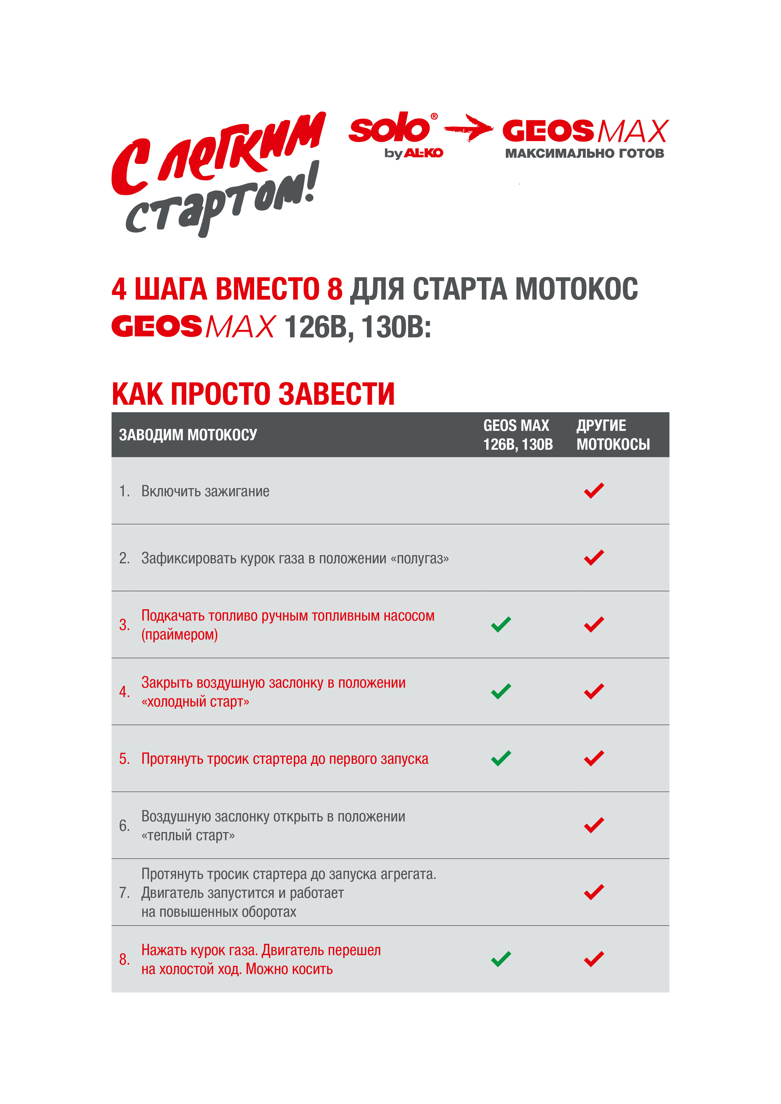 Бензиновая мотокоса GEOS MAX 130В -  мотокоса с повышенным моторесурсом, впечатляющим крутящим моментом, идеальное сочетание мощности, веса и наличие системы гашения вибрации. Завести не просто, а очень просто! 4 шага вместо 8! 1.     Подкачать топливо ручным топливным насосом (праймером) 2.     Закрыть воздушную заслонку в положении "холодный старт" 3.     Протянуть тросик стартера до первого запуска 4.     Нажать курок газа. Двигатель перешел на холостой ход. Можно косить Технические решения: ·       конструкция, ориентированная на пользователя, чтобы ваша работа была более легкой ·       двигатель с предварительной продувкой камеры сгорания от отработанных газов чистым воздухом ·       адаптированная конструкция для легкого маневрирования с меньшими усилиями Преимущества: - Лёгкая и удобная бензокоса - Облегченный запуск двигателя с минимальными усилиями. Упрощенная система запуска (всего 4 этапа) - Комфортная и неутомительная работа благодаря эргономичной, регулируемой "велосипедной" рукоятке - Удобная ременная оснастка ранцевого типа "Comfort Plus" на оба плеча с защитой бедра для снижения нагрузки во время работы - Простая в использовании полуавтоматическая триммерная головка "Fast & Easy"(быстро и просто) с простой загрузкой триммерной лески. Трехлопастной нож по густой поросли для травы, сорняков и мелких кустарников. - Комбинированную  защиту можно использовать с ножом для травы или триммерной головкой - Ручка для транспортировки Технические характеристики   Артикул 227613 GEOS name Мотокоса бензиновая GEOS Max Premium 130 B Двигатель 2-тактный Объем двигателя, см3 29,5 Мощность, кВт/л.с. 0,9 /1,2  9500 мин-1 Обороты (холостой ход) 3200 (±200) мин-1 Объем топливного бака, мл 650 Фильтр Комбинированный (фетр и поролон) Рукоятка Велосипедная Система запуска Полугаз (Упрощённая, 4 этапа) Тип вала Жесткий Режущая гарнитура в комплекте        Полуавтоматическая головка  (простая загрузка лески) М10х1,25 LH и нож для травы (3 зуба), Диаметр лески, мм 2,4 Ширина прокоса, см 41,5 Вес (нетто), кг 6,4  Снаряжение для переноски         Ременная оснастка ранцевого типа "Comfort Plus" Подробный видеообзор и тест бензиновой мотокосы GEOS MAX 130B Для старта мотокосы всего 4 шага: