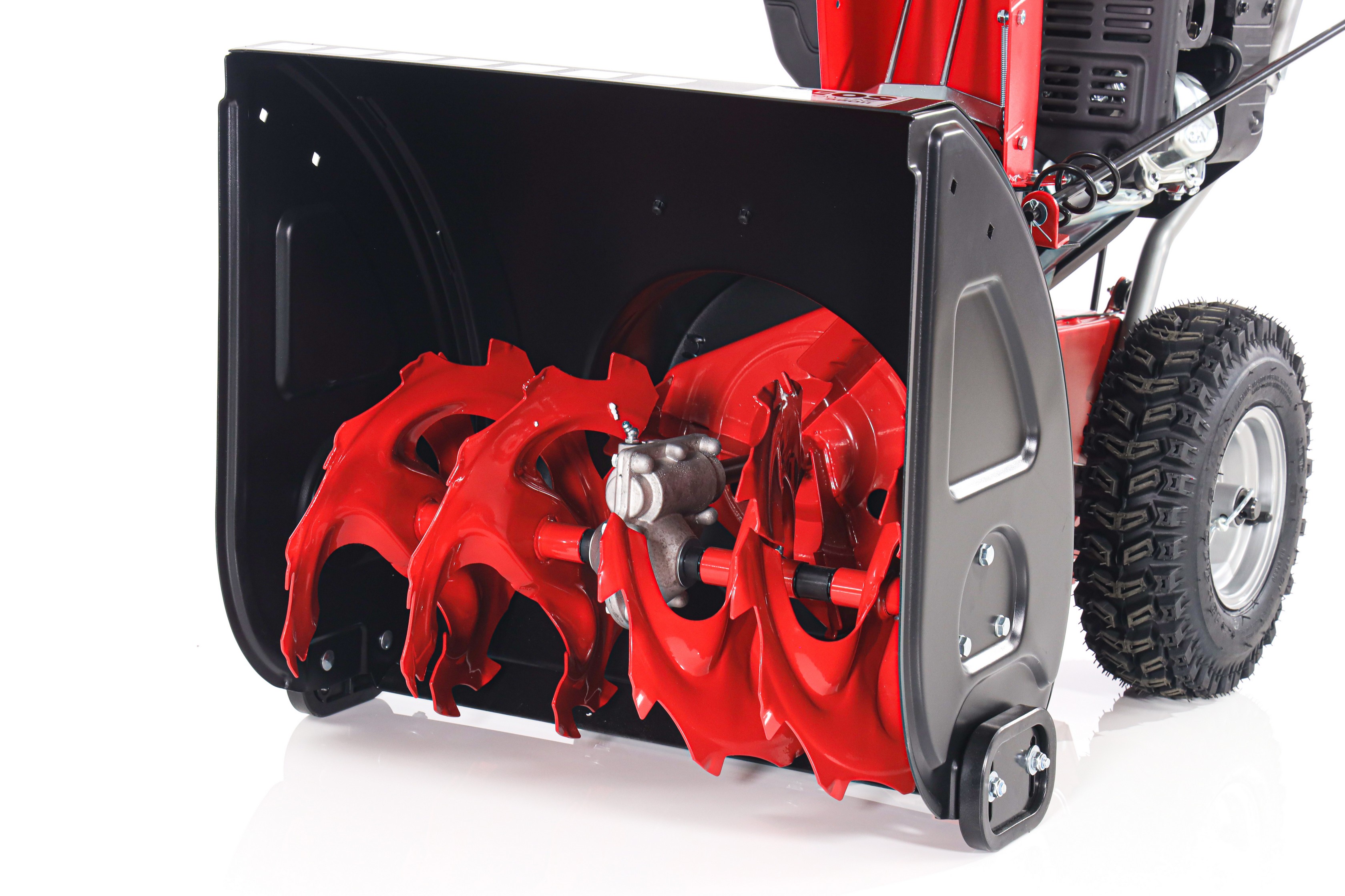Подробное описание Снегоуборщик GEOS SnowLine 560 II. Двухступенчатый самоходный снегоуборщик GEOS SnowLine 560 II 212933 идеальный инструмент для уборки снега. Может использоваться для уборки снега на узких тротуарах, проезжих дорогах и небольших парковках. Немаловажную роль при работе снегоуборщика оказывает двигатель. На снегоуборщик GEOS SnowLine 560 II установлен специальный зимний двигательработает при любых минусовых температурах. В отличии от летних двигателей (Zongshen и аналоги) спроектирован специально для работы в зимних условиях: нет воздушного фильтра, увеличенная рукоятка пускового троса (для возможности заводить двигатель в перчатках), дополнительные защитные кожухи (двигатель быстрее прогревается и выходит на рабочий режим, стабильнее работает в морозы). Устойчивость на льду и высокую проходимость на рыхлом снегу, обеспечивают колеса с агрессивным протектором. Преимущества снегоуборщика GEOS SnowLine 560 II: Cпециальный зимний двигательработает при любых минусовых температурах. Мощность 4 кВт. Металлический желоб (труба) выброса. Обеспечивает долговечность конструкции. Металлический ковш и шнек. Справляются с любым типом снега. Разблокировка колес шплинтом на колесе. Предназначена для улучшения маневренности снегоотбрасывателя. Разблокировка происходит за счет освобождения от жесткого соединения шплинтом ступицы колеса от ведущего вала. Регулировка направления выброса регулируется вращением рукоятки, вынесенной к оператору. Поворот желоба выброса190°. Регулировка дальности выбора осуществляется вручную путем наклона дефлектора на желобе выброса. Фиксируется барашком. Металлические полозья. Регулировка по высоте позволяет защитить поверхность и дает возможность работать на любых покрытиях, включая плитку и брусчатку.